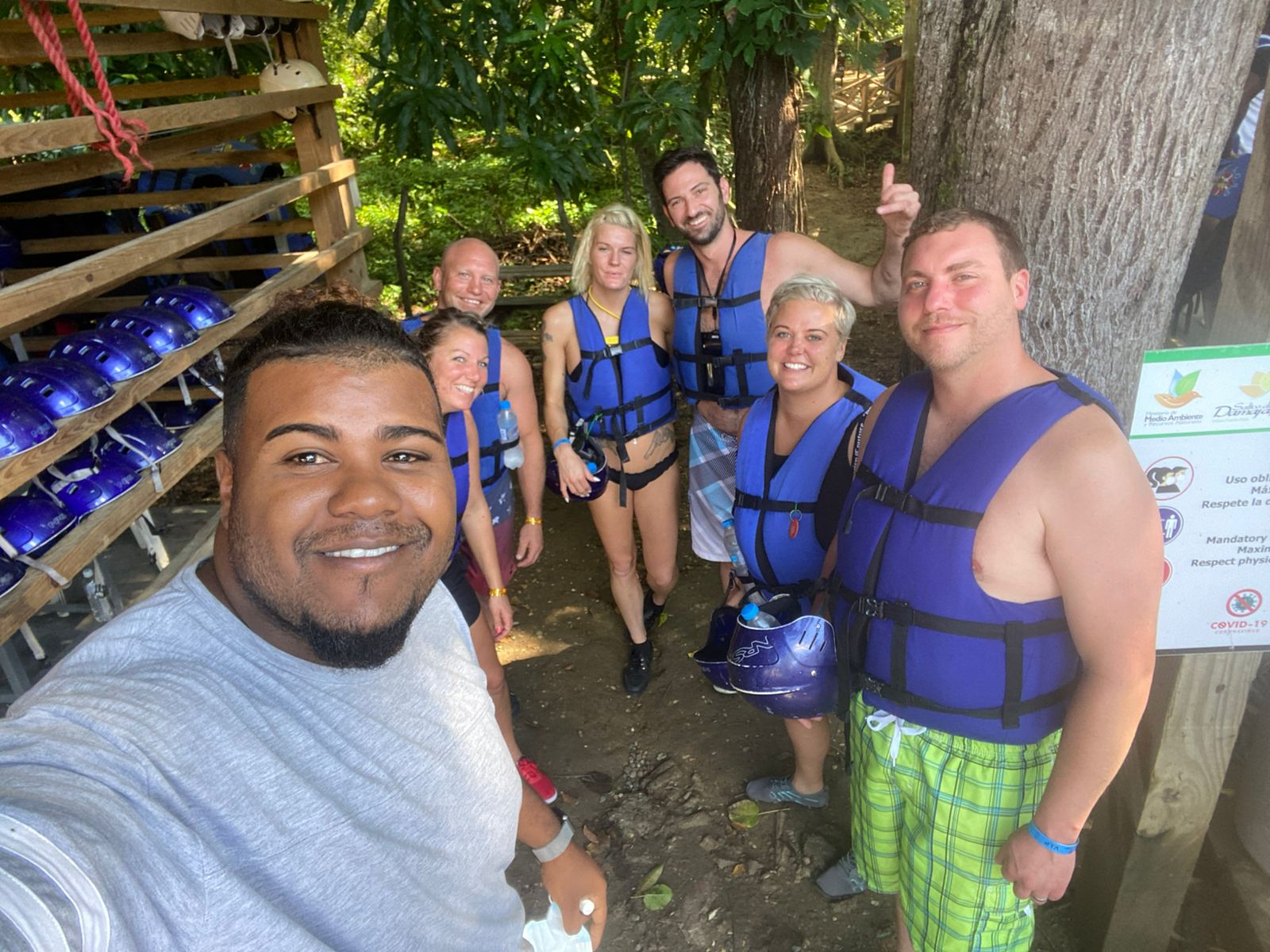 Selfie con nuestros clientes antes de entrar a las Cascadas de Damajagua, listos para vivir una aventura segura y divertida. Equipados con cascos y chalecos salvavidas, disfrutan del ambiente natural y la emoción previa al recorrido. Tú también puedes ser parte de esta experiencia única en Puerto Plata — reserva tu tour con nosotros y vive la aventura. 🌿💦